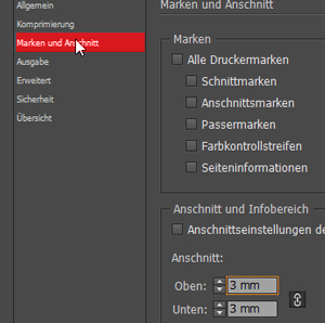 4. Stellen Sie unter dem Menüpunkt Marken und Anschnitt den Anschnitt auf allen vier Seiten auf die zuvor angelegten 3mm ein.