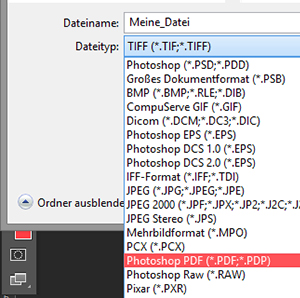2. Wählen Sie den Speicherort, vergeben Sie einen eindeutigen Namen und wählen Sie als Dateityp Photoshop PDF (*.PDF; *.PDP).